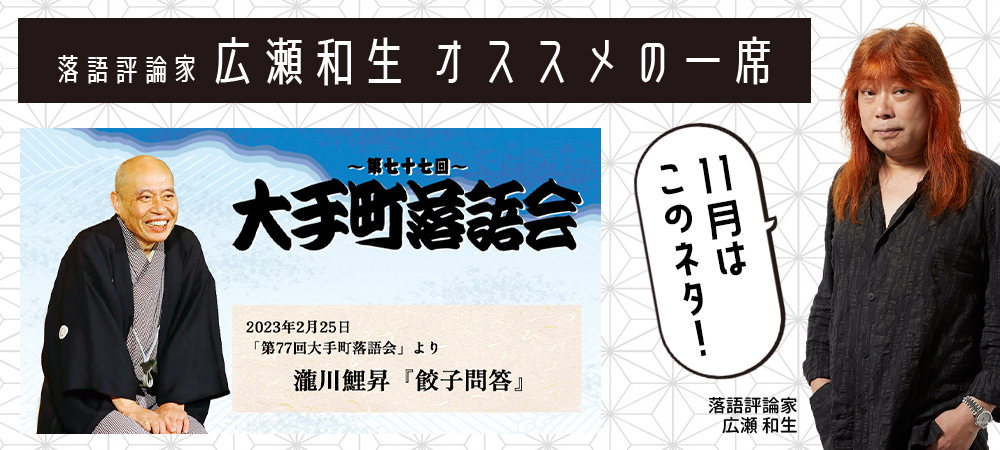 今月は「第七十七回大手町落語会 」(令和5年2月25日公演)から瀧川鯉昇「餃子問答」をお届けします。
