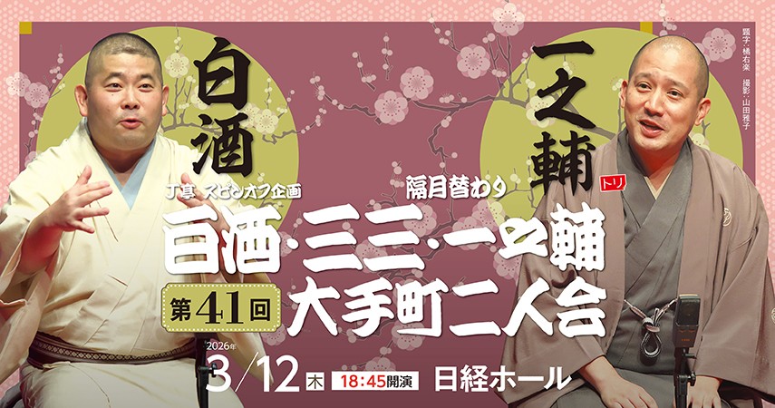公演詳細 J亭スピンオフ企画 41 白酒・一之輔 大手町二人会 公演配信 出演:桃月庵白酒、春風亭一之輔 (トリは柳家三三)開演:2026年3月12日(木)18:45会場:日経ホール会場チケット:4400円 → 産経らくご会員価格:4100円ライブ配信:2026年3月12日(木)18:45~アーカイブ配信期間:~2026年4月9日(木)18:45 この公演の見どころ人気実力派落語家、桃月庵白酒、柳家三三、春風亭一之輔が隔月替わりでお送りする二人会「J亭スピンオフ企画」。 第41回は、白酒と一之輔が登場します。 毒気のある笑いが持ち味の白酒と、笑点メンバーとしても人気の一之輔。 脂の乗った師匠二人の高座をお楽しみ下さい。